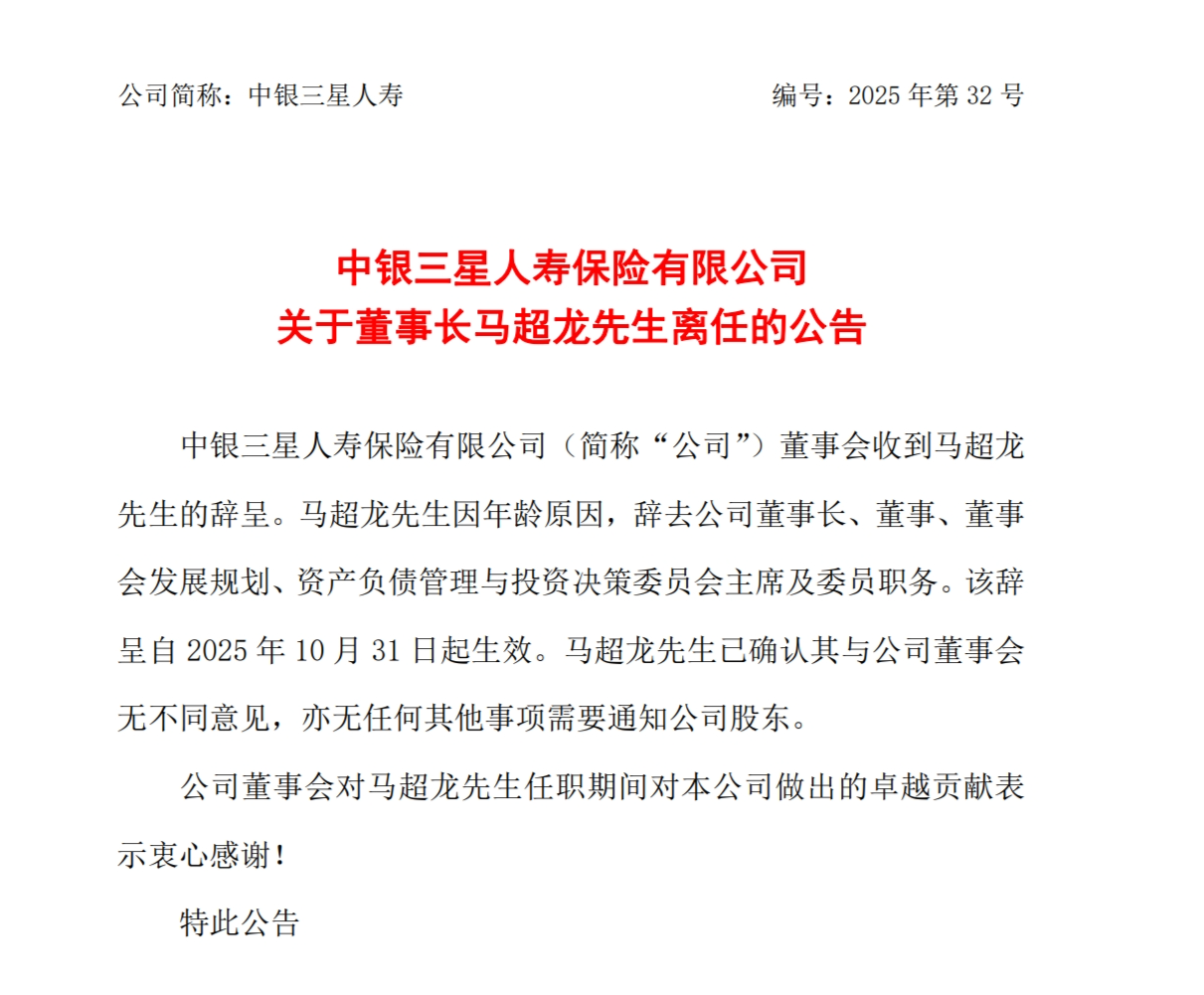 公司董事会收到马超龙的辞呈。马超龙因年龄原因,辞去公司董事长、董事、董事会发展规划、资产负债管理与投资决策委员会主席及委员职务。该辞呈自2025年10月31日起生效。公司董事会对马超龙任职期间对本公司做出的卓越贡献表示衷心感谢!