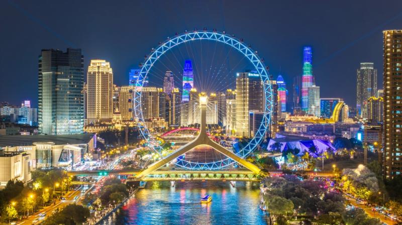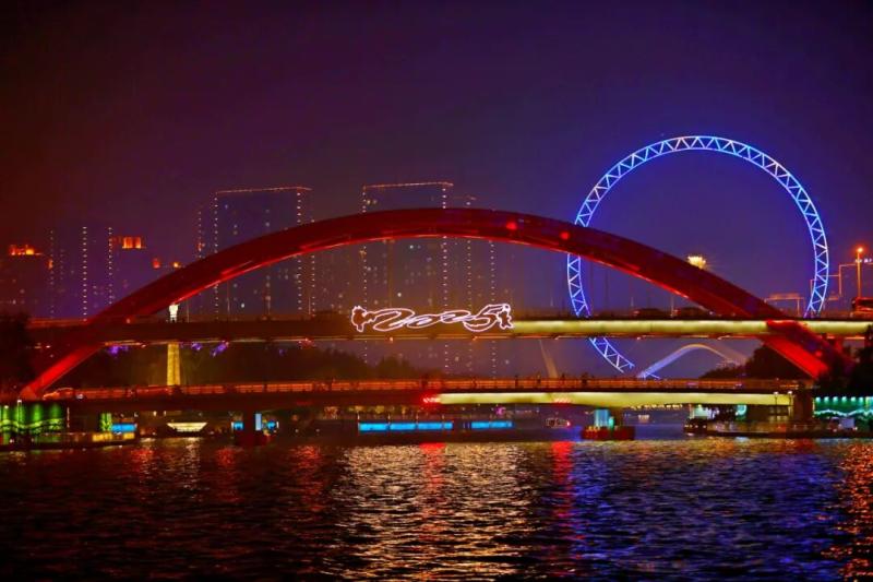 “津眼秀”以摩天轮为载体,激光雕刻出“万花筒”般的动态效果,“我爱天津”的字样随轮缓缓转动,点亮夜空;