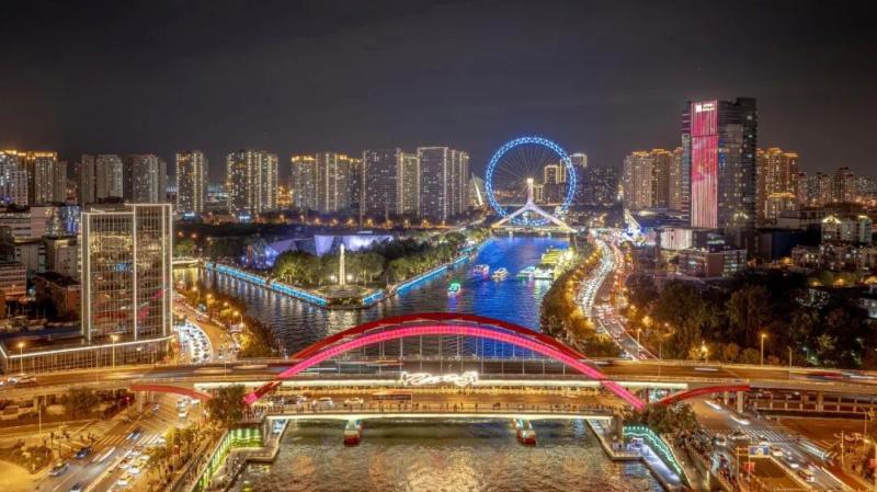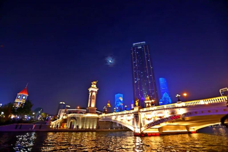 整场城市灯光秀或映着桥梁的灵动线条,或衬着历史建筑的厚重轮廓,让傍晚的海河化作一幅流动的光影画卷。