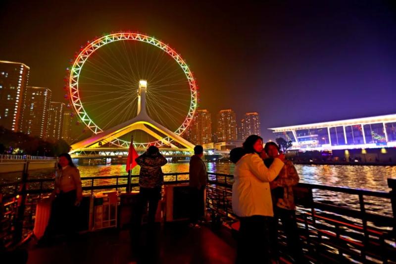 天石舫码头边,天津之眼的轮廓在暮色中渐显,悠扬的民乐旋律从轮下飘来,晚风都裹着柔暖的浪漫;