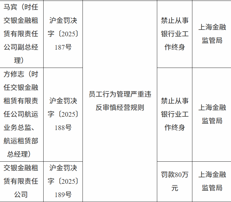 11月19日,国家金融监督管理总局上海监管局行政处罚信息公开表显示,交银金融租赁有限责任公司因员工行为管理严重违反审慎经营规则被罚款80万元;马某、方某志被禁止从事银行业工作终身。